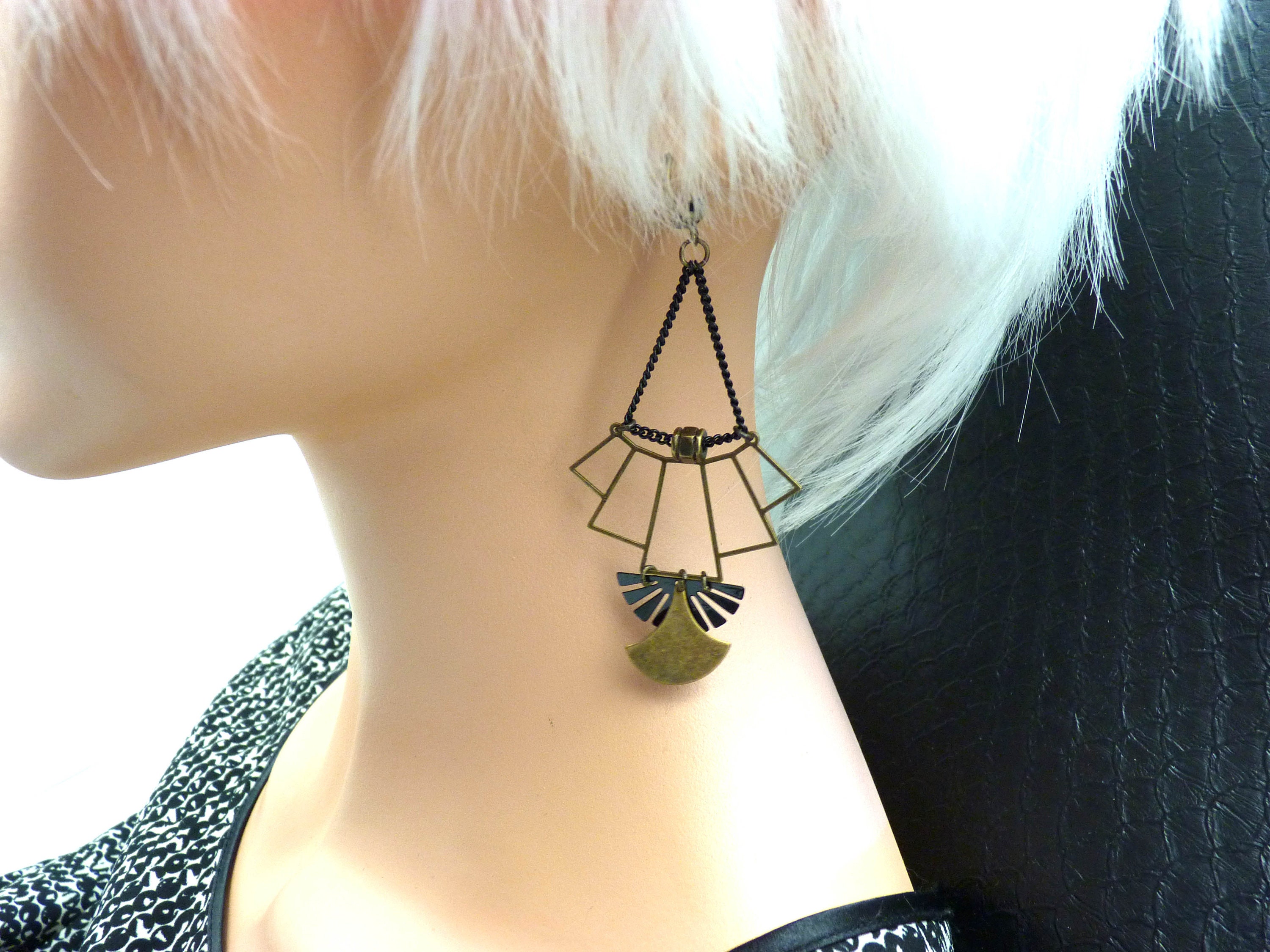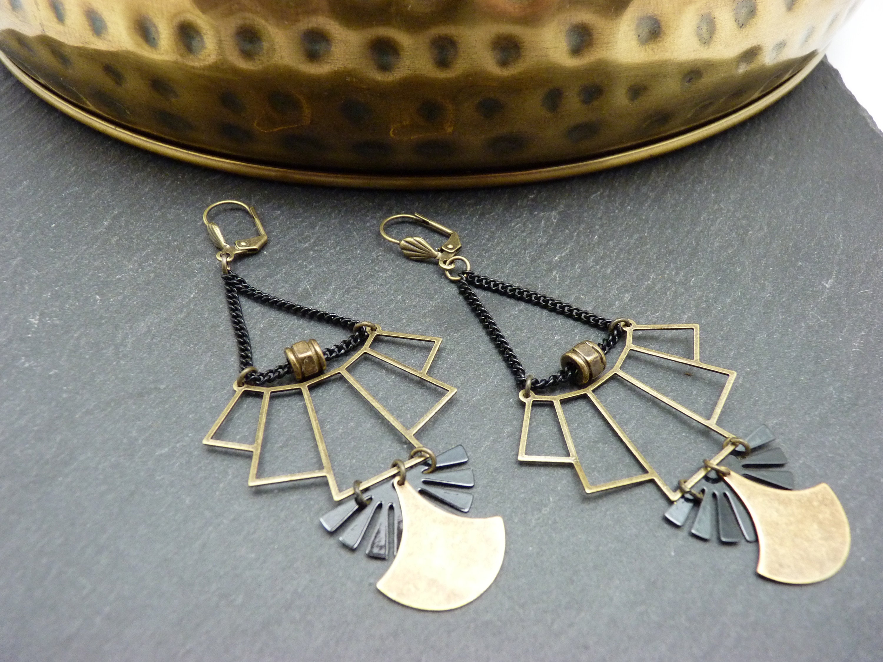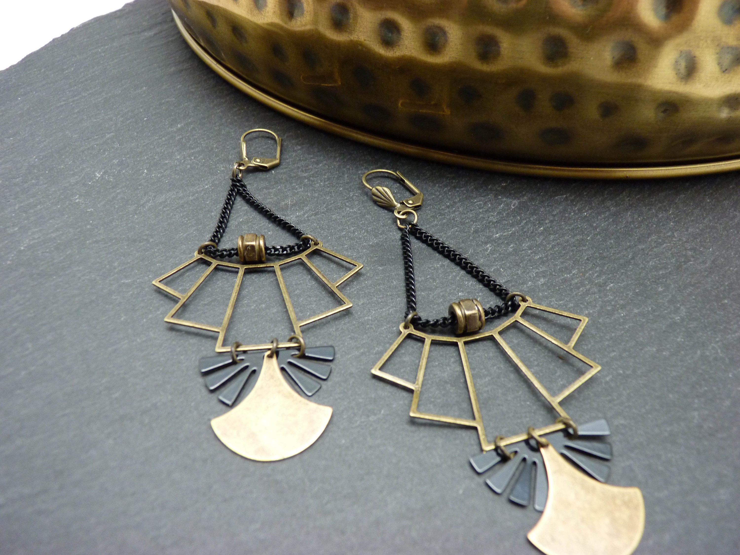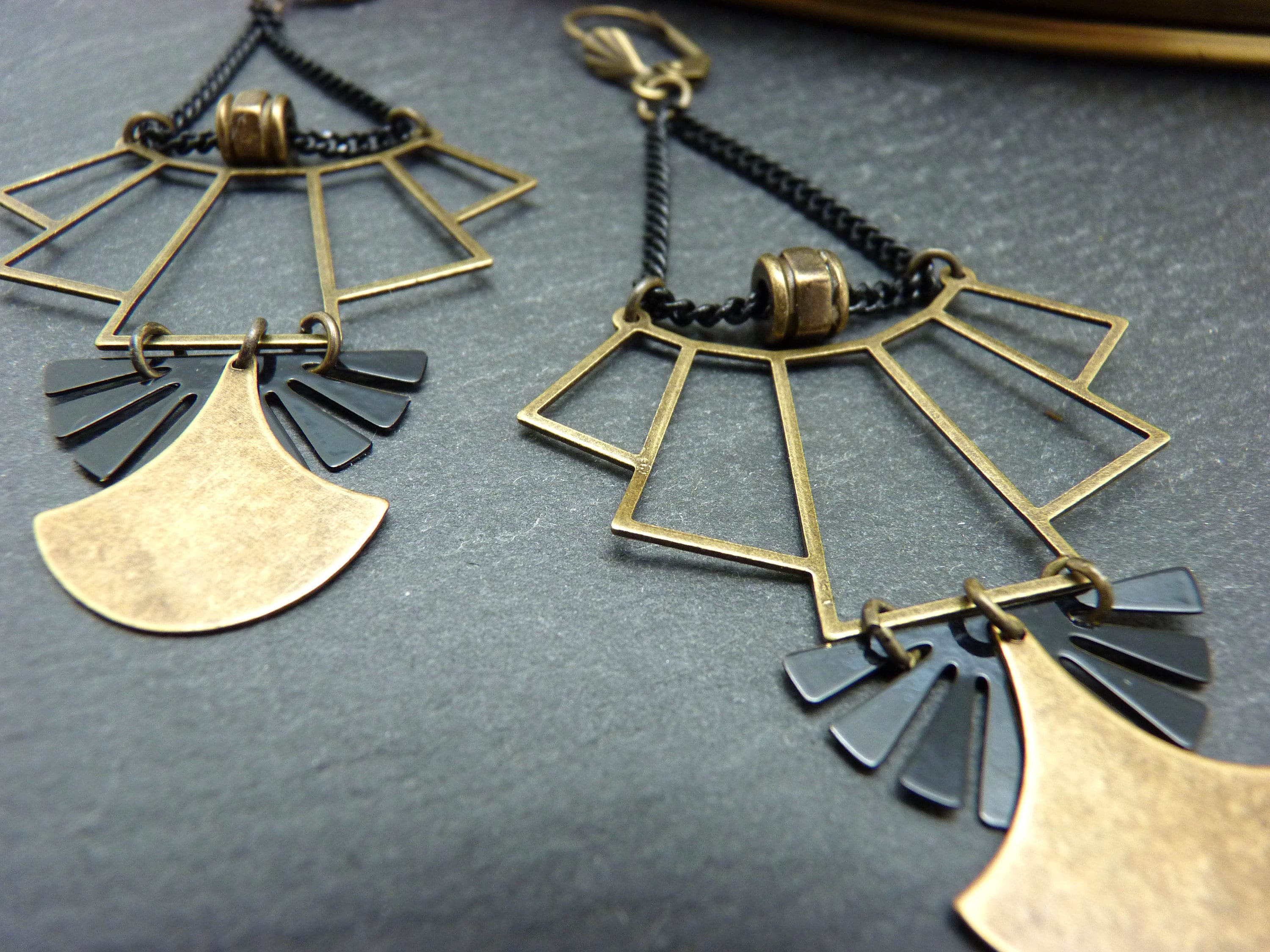 Bronze and black all-metal earrings in an art deco style. A light, graphic design.