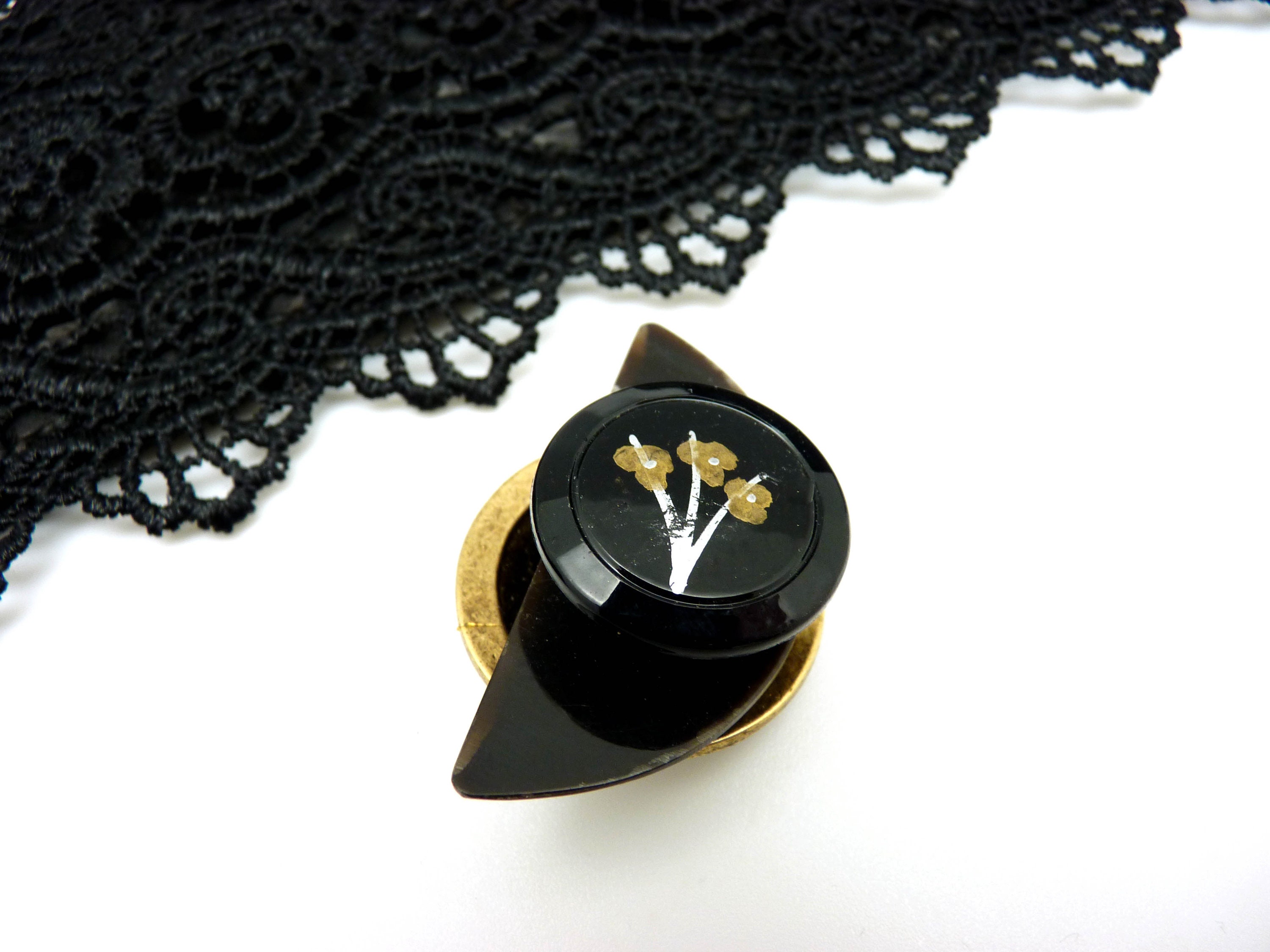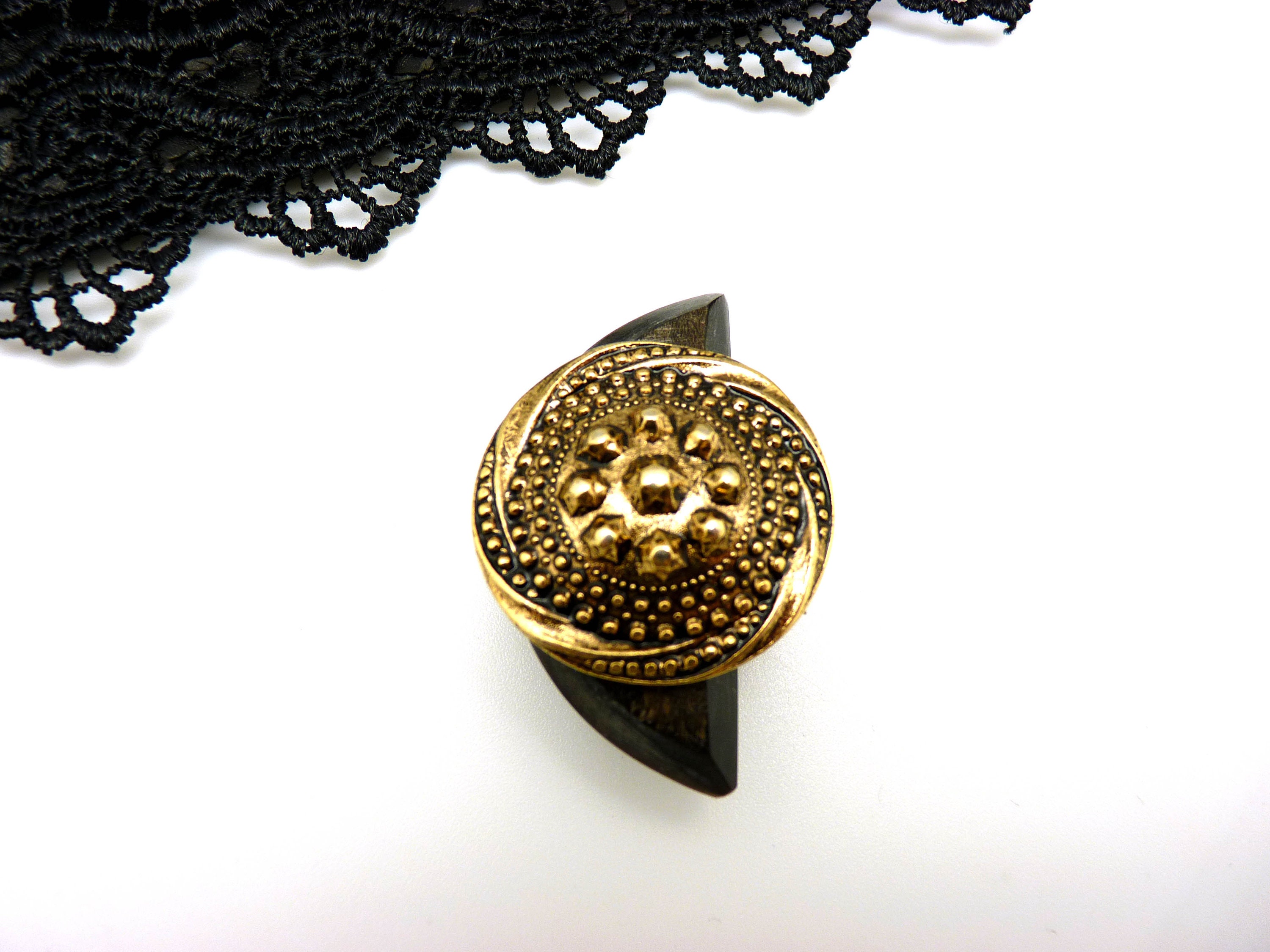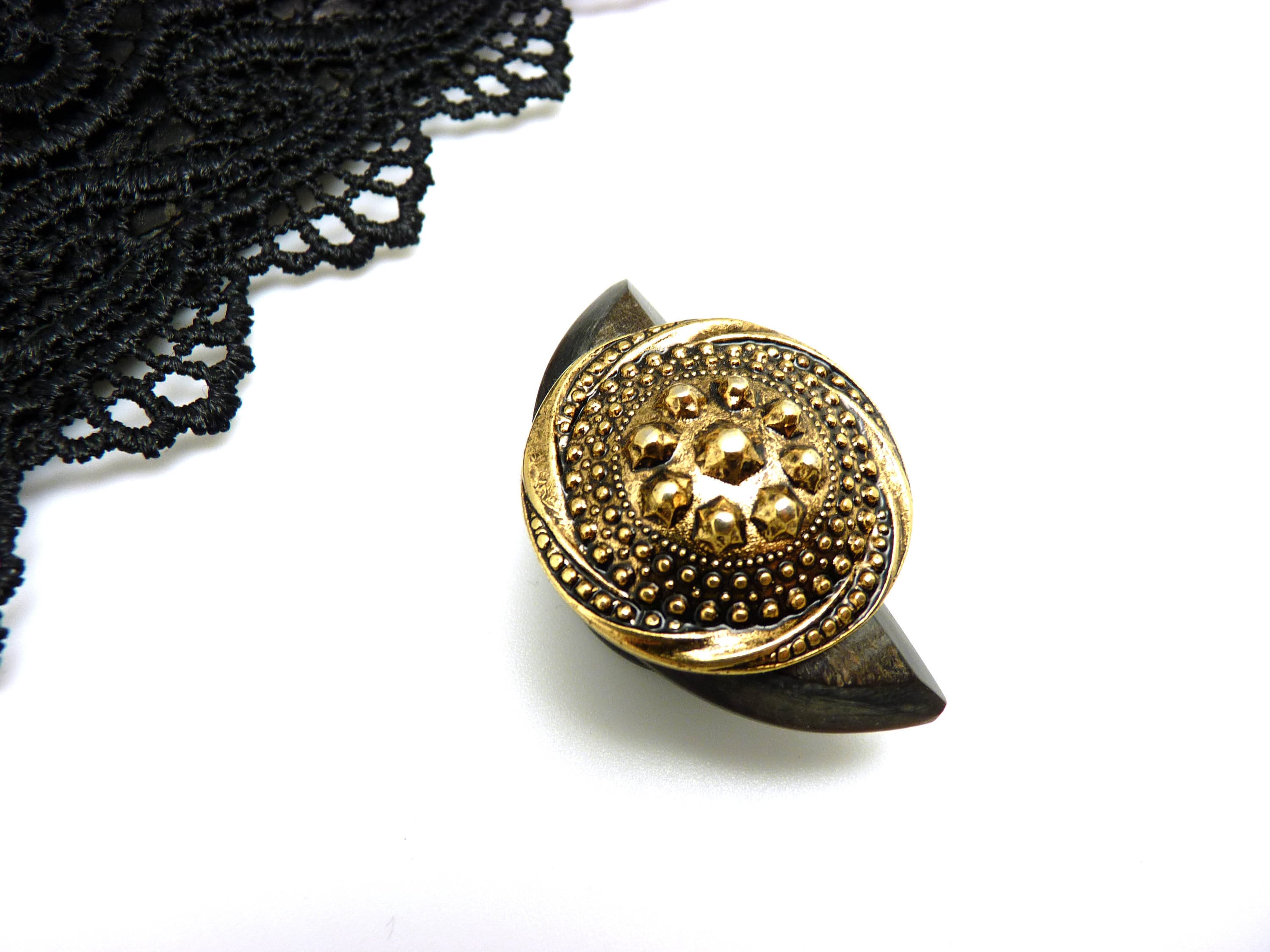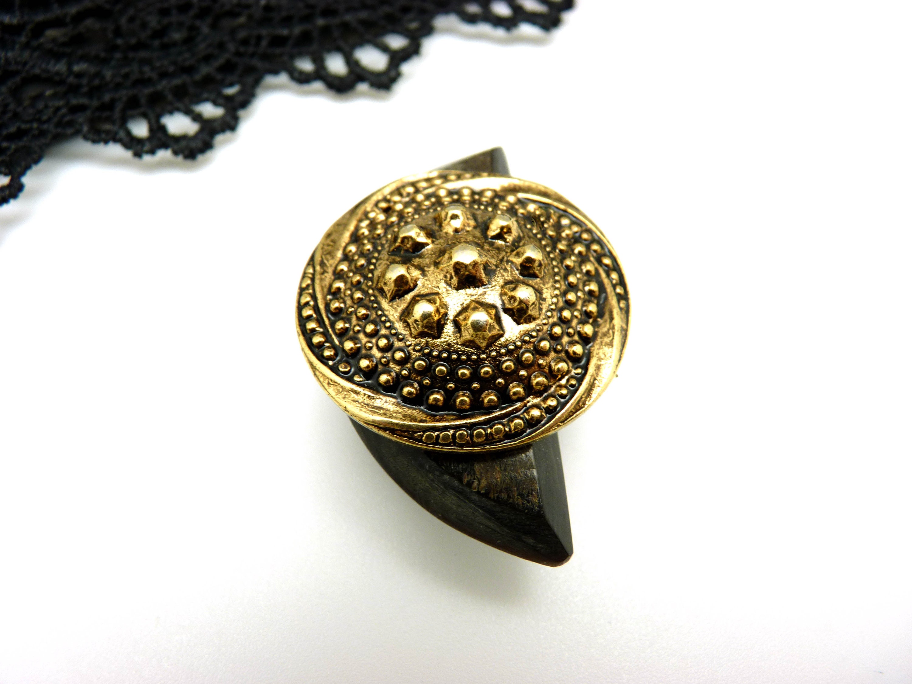Broche aimantée en corne forme demi-lune, et métal travaillé vieil or. Dans un esprit chic ethnique.