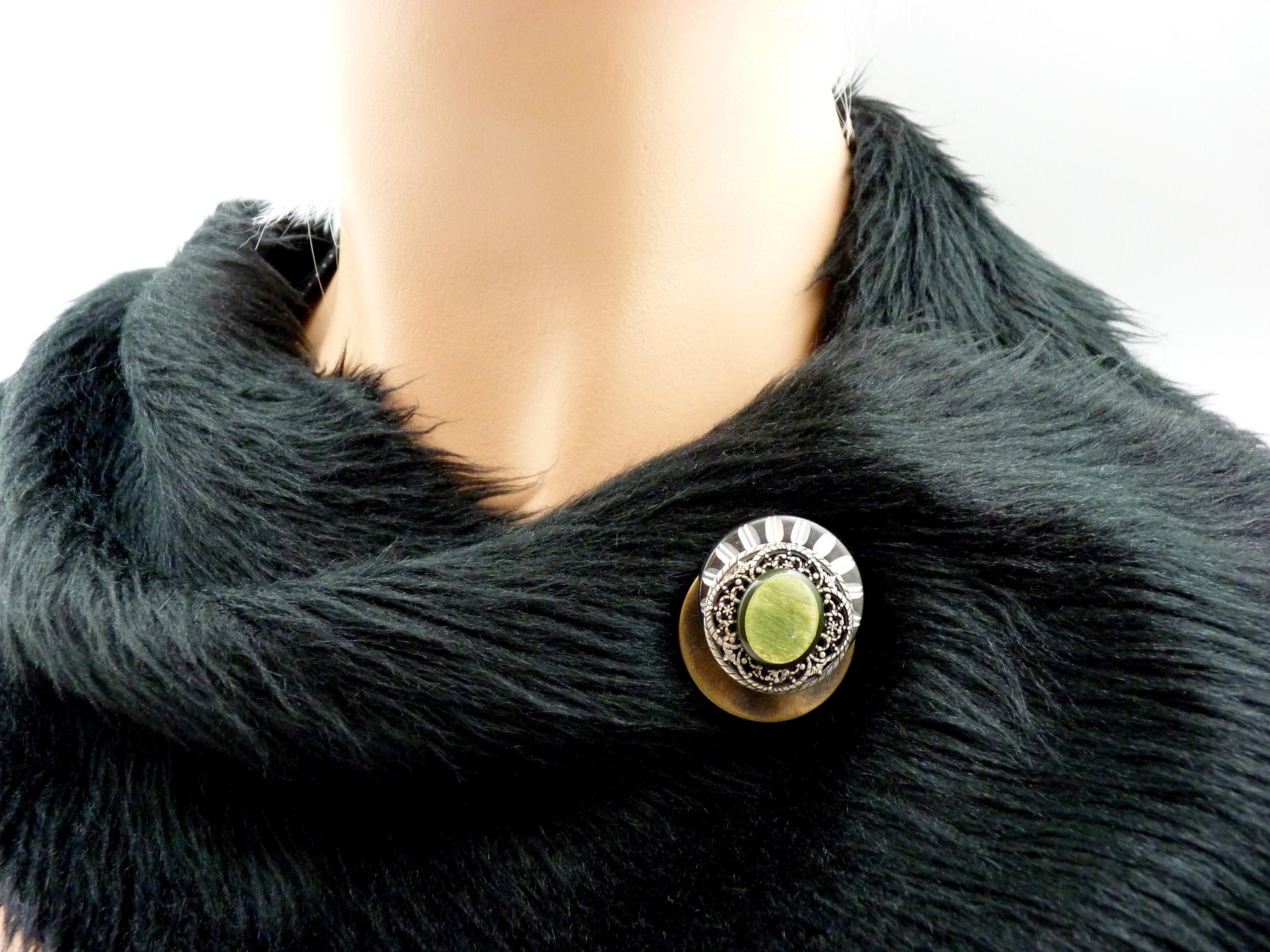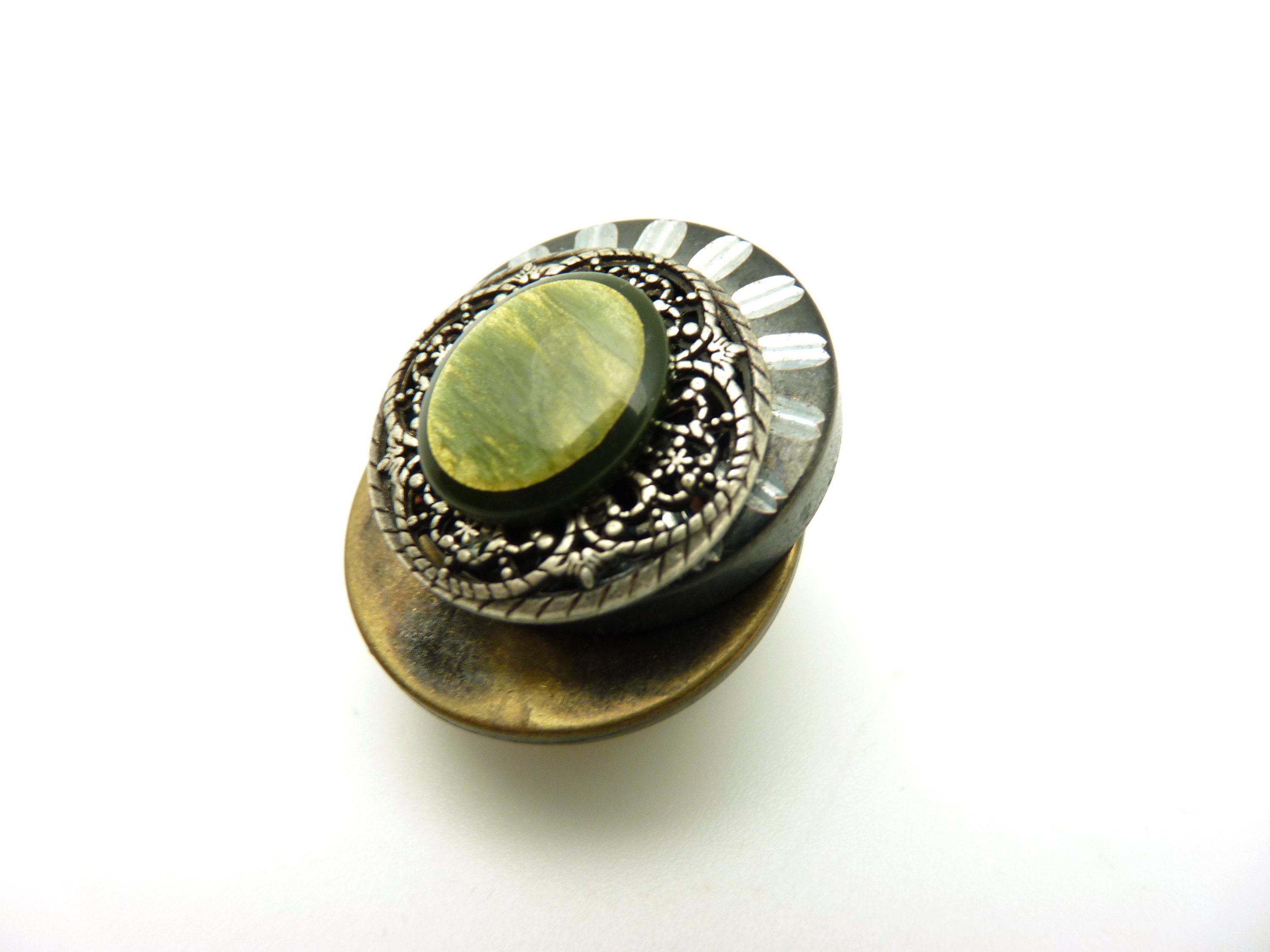 Broche aimantée en métal bronze, argent et noir avec une résine ovale kaki vert olive.