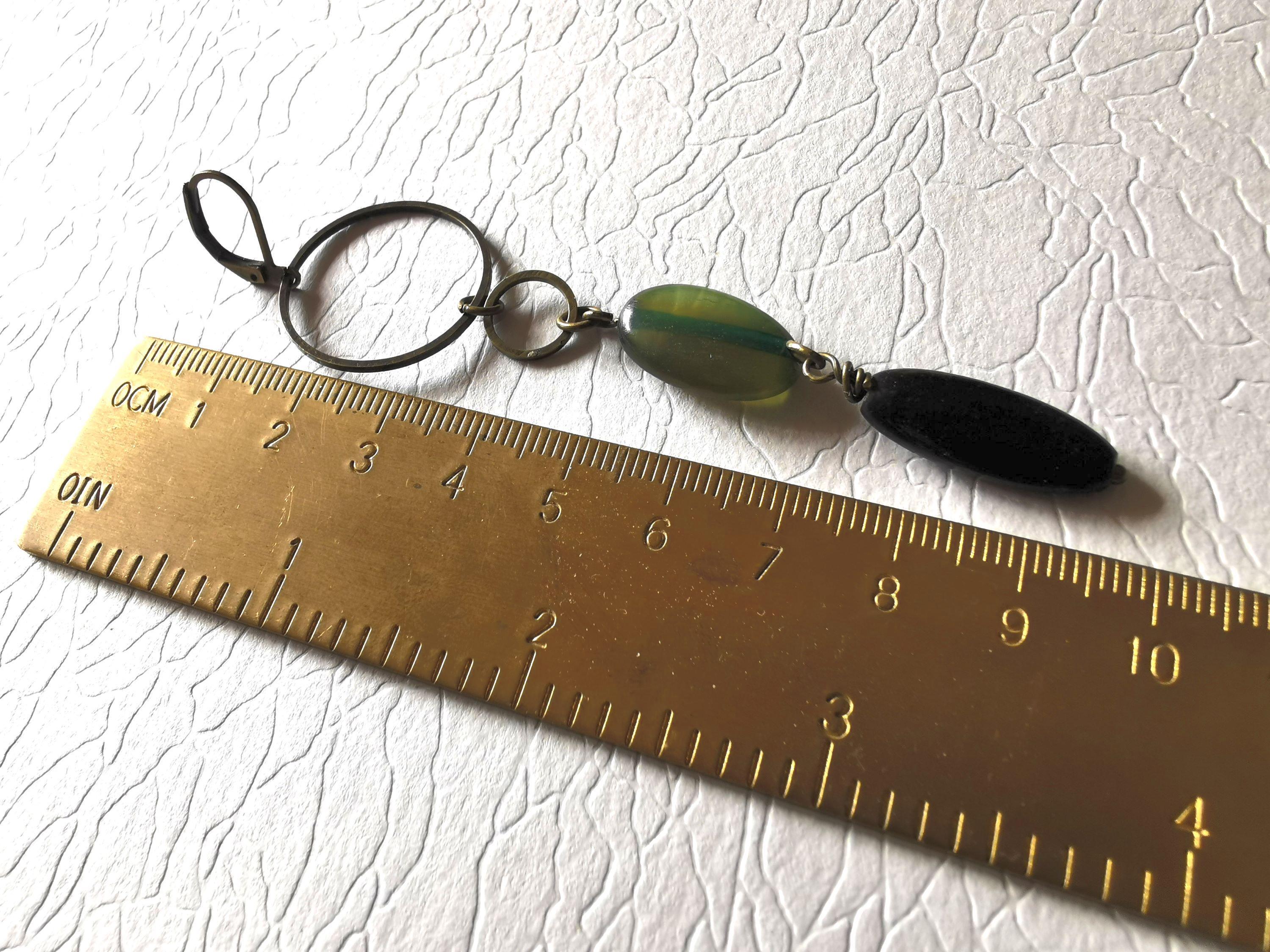 Imagine the combination of materials: a luminous green horn bead meets an intense black navette, all mounted on bronze metal circles. Each element is articulated for a fluid movement, which comes to life with a discreet grace throughout the day.